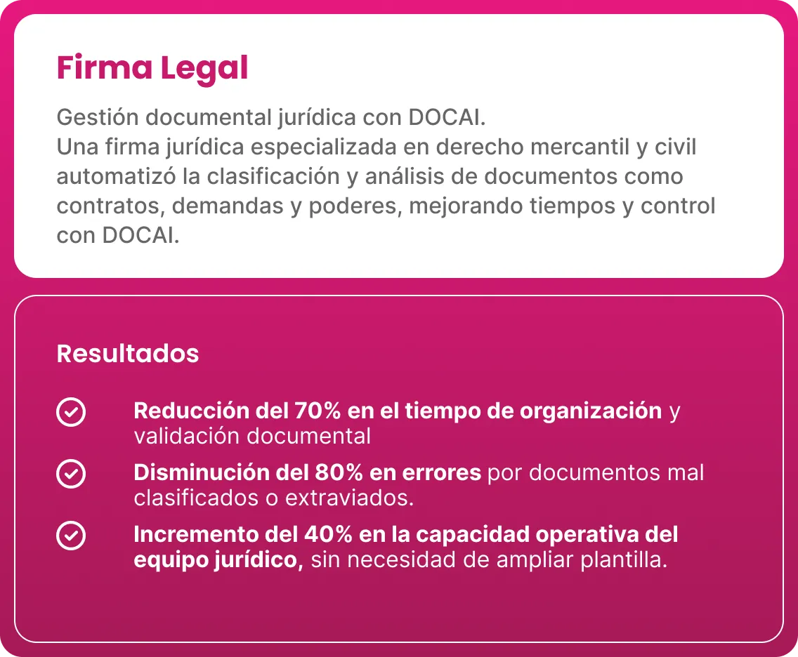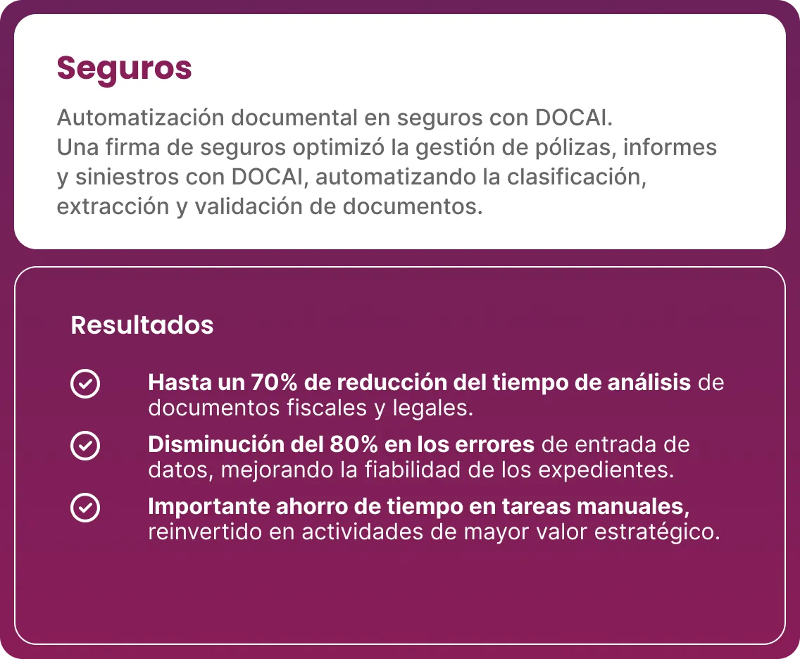 Optimiza recursos y tiempos de procesamiento, permitiendo que tu equipo dedique su tiempo a tareas de mayor valor mientras DOCAI gestiona lo repetitivo.
