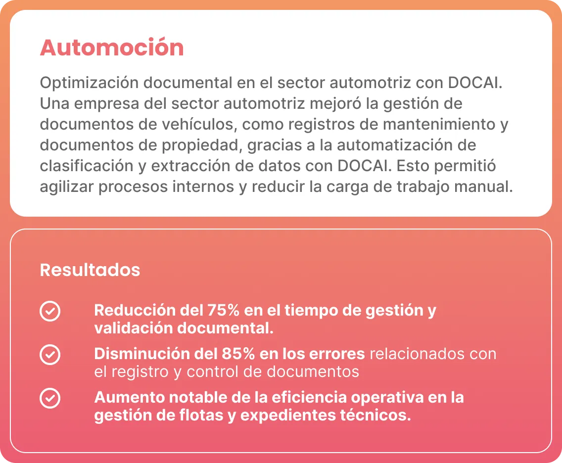 Elimina errores humanos y tareas repetitivas: DOCAI automatiza la lectura y procesamiento de documentos para que tu equipo deje atrás el copiar, pegar o revisar manualmente información.